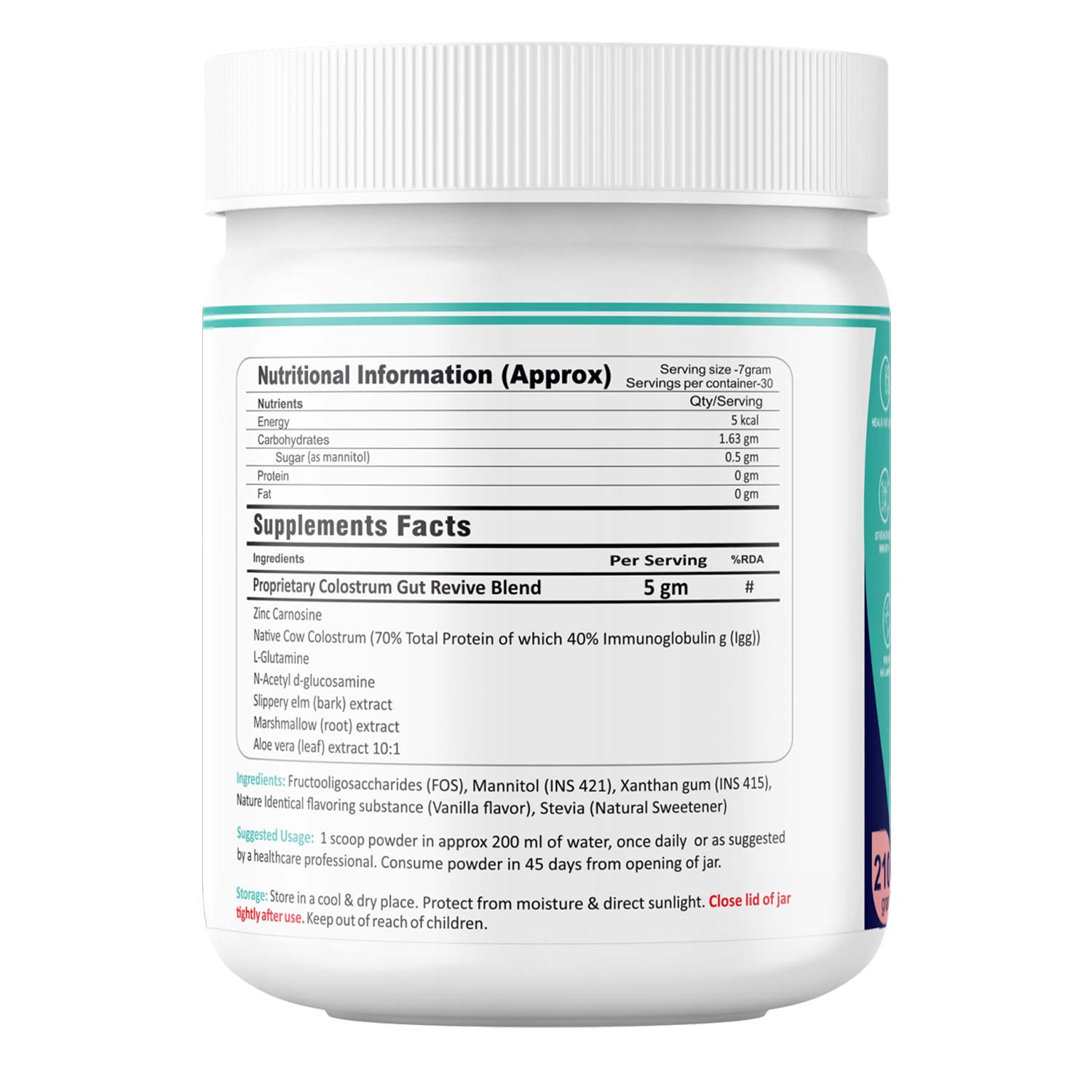 Colostrum Gut Revive is a specialized Leaky Gut formula designed to heal and strengthen the gut lining, reduce inflammation, and support overall digestive health.