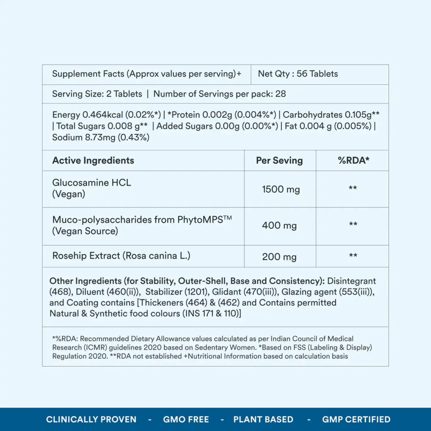 - Vegan Glucosamine HCL: Helps rebuild and maintain joint cartilage. Supports flexibility and overall joint comfort.