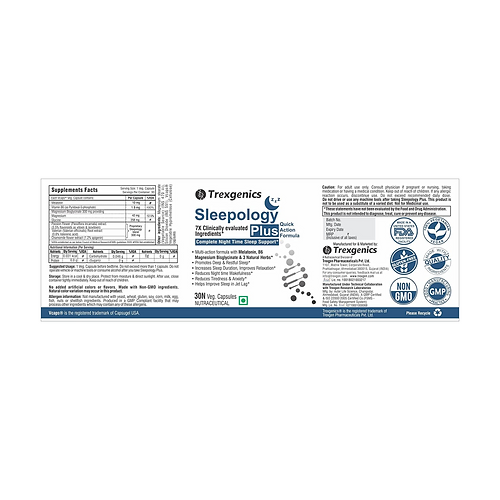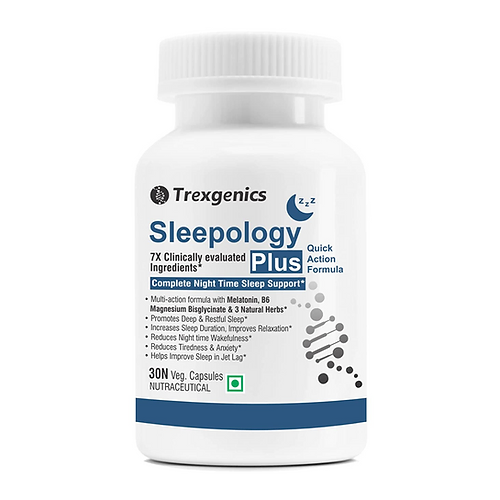 Trexgenics Sleepology Plus is a powerful sleep aid capsule designed to enhance sleep quality and duration. Formulated with Melatonin, P5P (Vitamin B6), Magnesium Bisglycinate, Valerian, Passion Flower, and Chamomile, it promotes deep, restful sleep, reduces anxiety and stress, and supports relaxation.